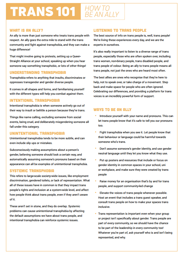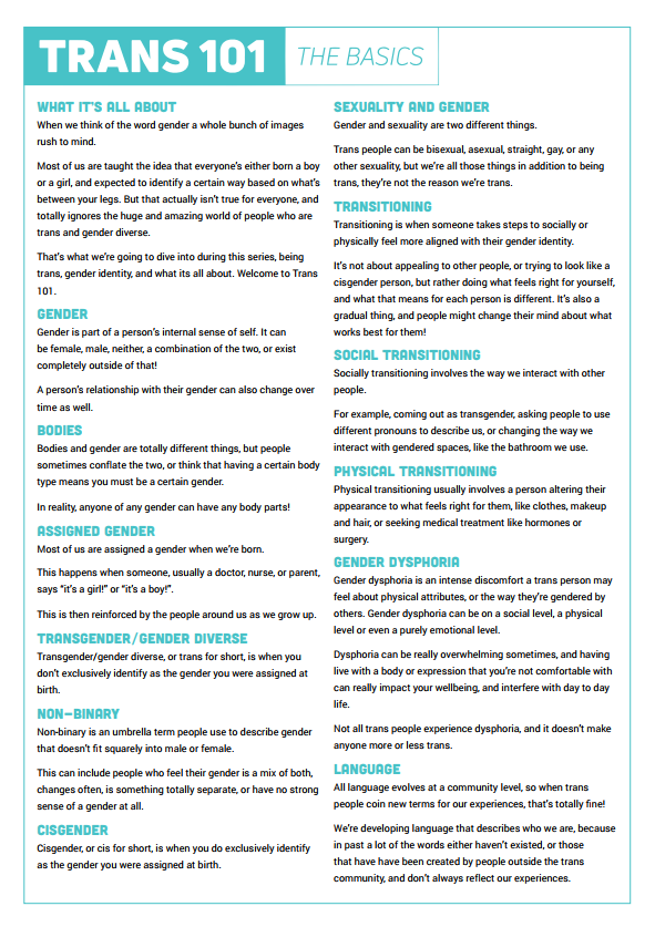 This multimedia resource - including free downloadable videos and written guides - is an accessible and comprehensive introduction to understanding trans identities and how to support trans people. Visit www.trans101.org.au to access the resources.