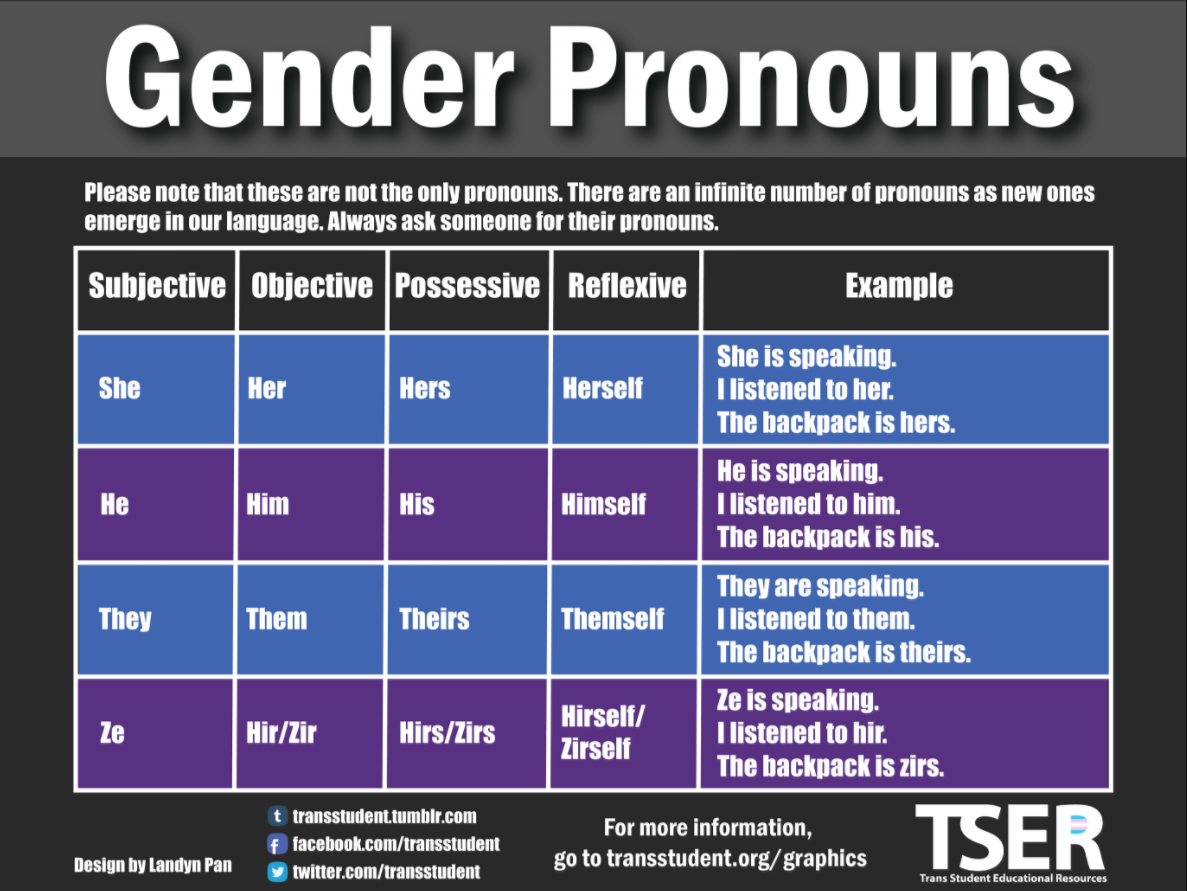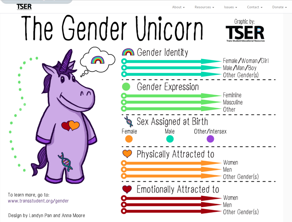 - Trans Student Education Resources: Advocacy, information and empowerment for trans+ students in the USA. Resources and downloadable infographics on gender identity, pronouns, and other information from: http://www.transstudent.org/graphics