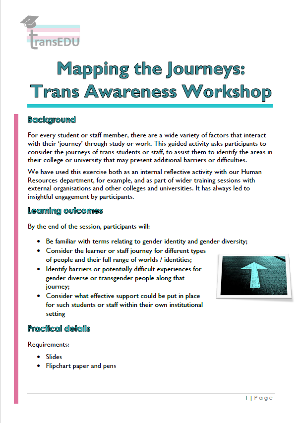 For every student or staff member, there are a wide variety of factors that interact with their ‘journey’ through study or work. This guided activity asks participants to consider the journeys of trans students or staff, to assist them to identify the areas in their college or university that may present additional barriers or difficulties. We have used this exercise both as an internal reflective activity with our Human Resources department, for example, and as part of wider training sessions with external organisations and other colleges and universities. It has always led to insightful engagement by participants.